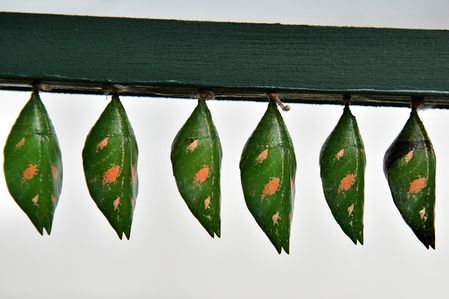 向前看齐!----3月31日,英国自然历史博物馆的户外展览,一群叠蛹悬挂着。