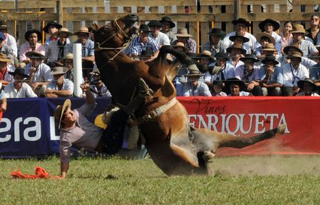 到底是谁在搏命演出?-----3月29日,一名高卓人在蒙得维的亚的传统牛仔竞技周中展示马技。