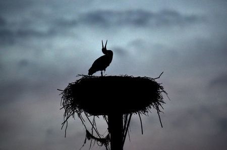 家的呼唤。----3月9日,德国中部Sandershausen,一只野生的鹳在巢中对着天空鸣叫的影像。