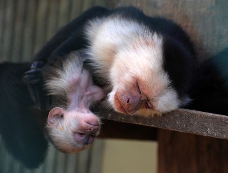 “终于哄睡了,当妈真累!”----3月6日,在萨尔瓦多皮卡乔保护区玫瑰瓦尔特动物园,母白面猴在幼崽旁边打瞌睡。