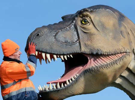 “谁如此大胆?敢从恐龙口中拔牙!?”----3月23日,在德国东部武斯特尔马尔克,恐龙的雕塑展展出的作品。