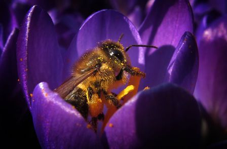 花心的幸福。----3月15日,在德国南部Kaufbeuren,蜜蜂采集从盛开的花中采集花粉。