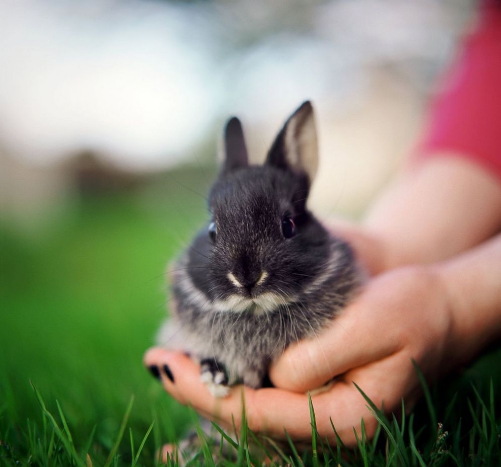 一名在草坪之上的女子手中臥著一隻可愛的小兔