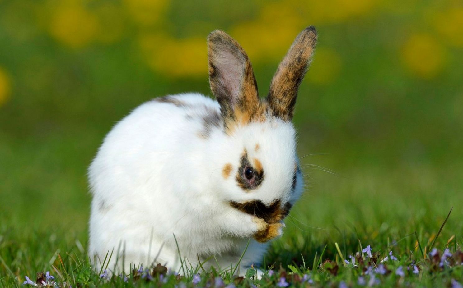 德国巴伐利亚州的花草甸中,一隻兔宝宝正在洗臉