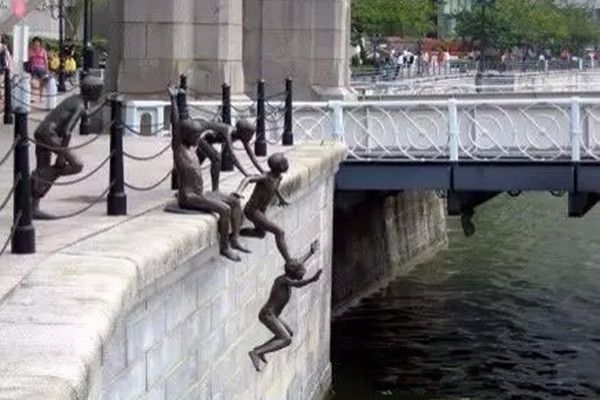 新加坡,五个赤裸男孩雕像,好像要跳入河中游泳,这是第一代到新加坡移民的孩子常做的体育活动。新加坡雕塑家Chong Fah Cheong的作品。