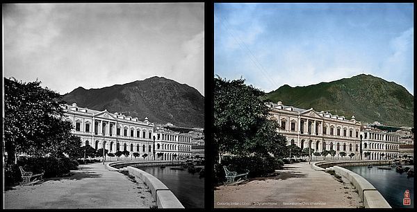 圖左爲香港大會堂(City Hall),與滙豐銀行總部(右)為鄰。右圖之彩照為今人加工。