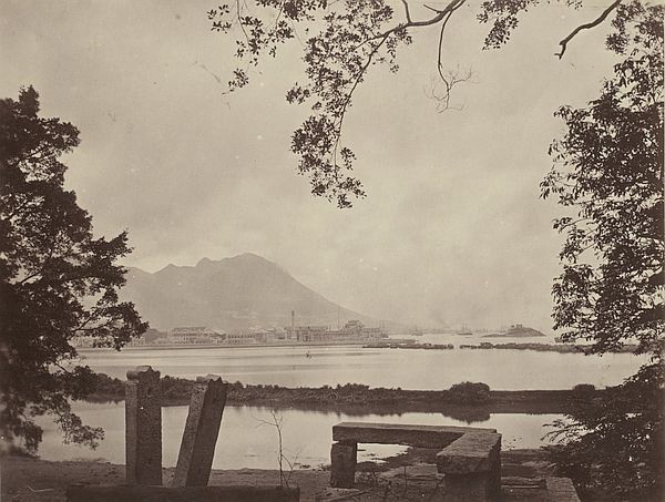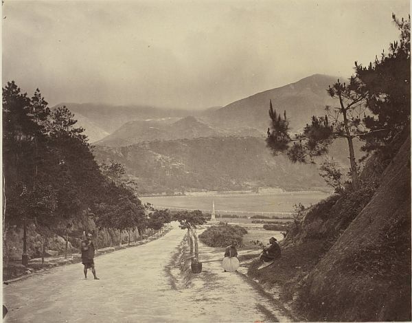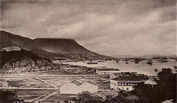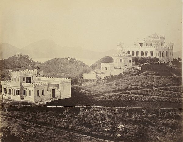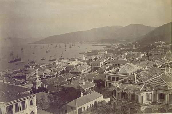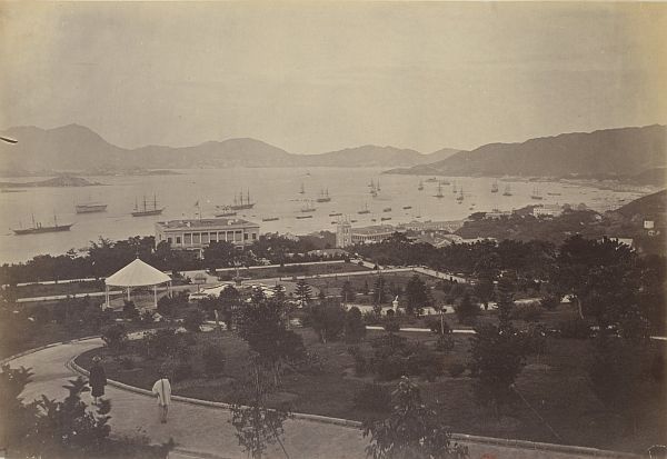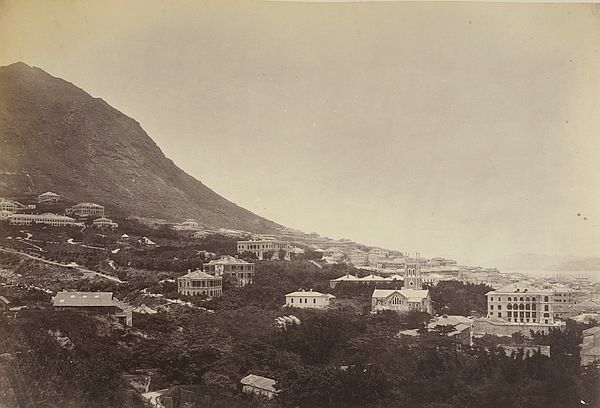由擺花街(Scandle Point)看香港島(半山)。半山為洋人住宅區。照片中可見花園道(Garden Road)、阿彬彌街(the Albany, 今雅賓利道)、植物公園(兵頭花園,今香港動植物公園)與督憲府(Government House, 圖正中央處)、聖約翰座堂(圖下右二)、法國外方傳道會大樓(French Mission Building, 圖下右一)。