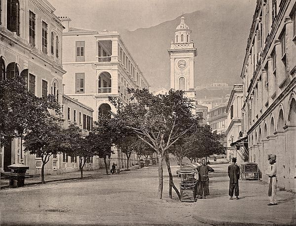 中環,必打街(Pedder Street, 畢打街)。圖左爲寶順洋行(顛地洋行),其旁香港大酒店(HongKong Hotel)。圖中的大鐘樓,建於1862年,具有報時及報火警的作用。圖右遠處為郵政總局(GPO)。圖右近處渣甸大樓(Jardine House)為怡和洋行的總部。