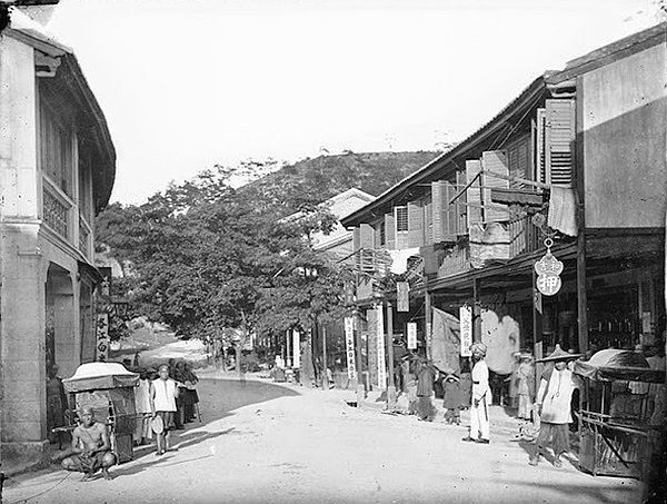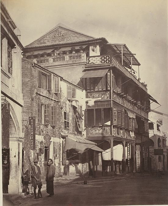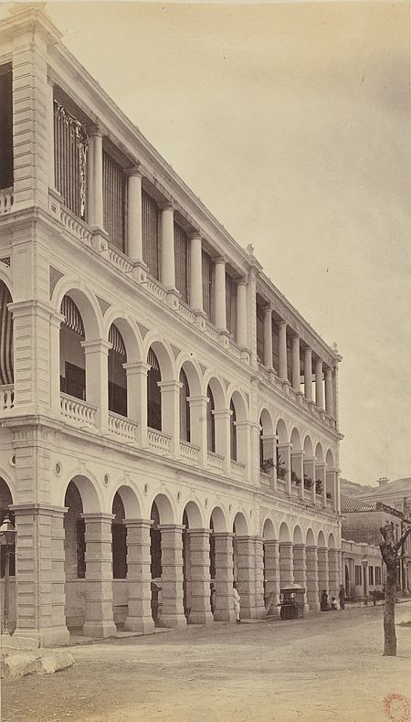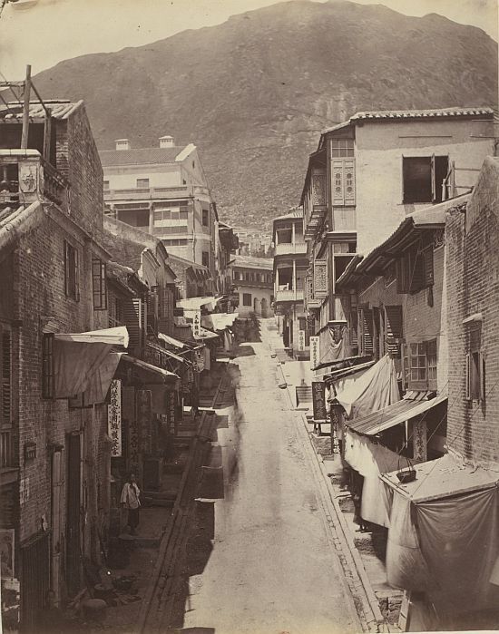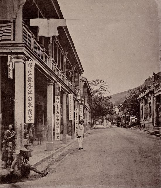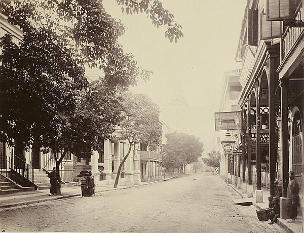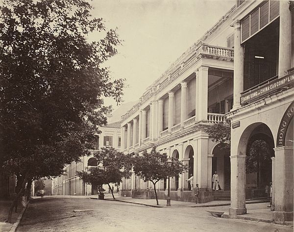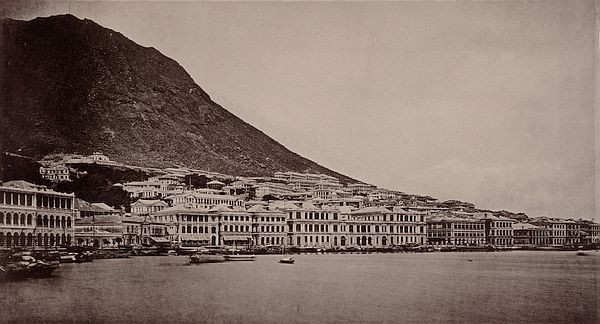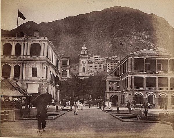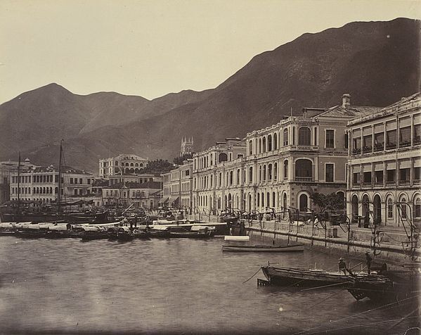 中環,海旁(the Praya Central,今德輔道中: Des Voeux Road Central)。圖最右為怡和洋行(Jardine Matheson & Co.)所在的渣甸大樓(Jardine House),隔著一條必打街與寶順洋行(Dent & Co. 顛地洋行)為鄰,二者主要營業項目為鴉片。攝於1860年代。