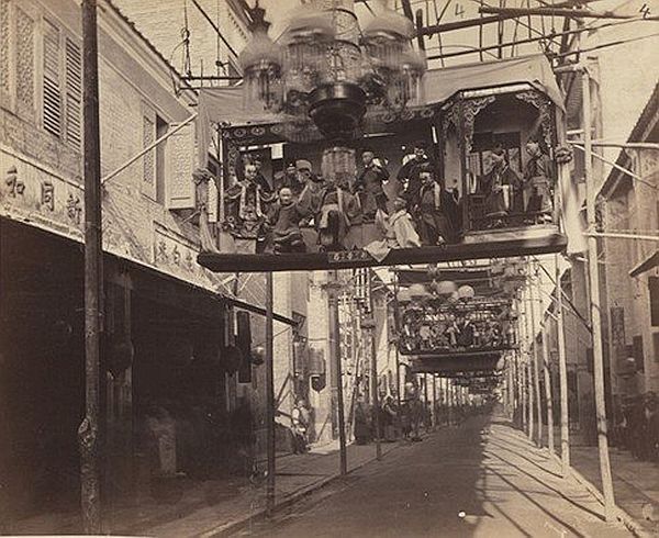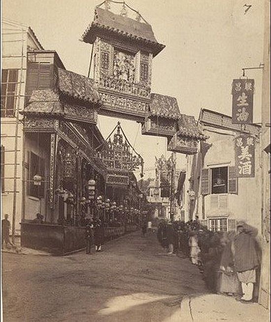中環,擺花街(Lyndhurst Terrace)的波斯燈飾,歡迎愛丁堡公爵艾爾弗雷德王子抵港。按,擺花街原名「倫核士街」,附近多西洋妓寨,洋鴇母要求尋芳客需帶鮮花一束,作爲見面禮。於是花檔遍設,花名遠播,令致中文街名改爲「擺花街」。