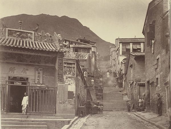上環,文武廟旁。圖右直望的是樓梯街(Ladder Street)。圖左為四環盂蘭公所,係文武廟的副堂。文武廟始建於1847年,位於荷李活道(Hollywood Road)上,主殿供奉文昌帝君及關聖帝君,兩旁有副堂,一邊是「公學」,另一邊是「公所」。公所為區內居民主持公道、排難解紛的地方。1857年,西營盤、太平山、上環及中區四區在公所成立四環盂蘭公所,負責盂蘭節的籌備工作。