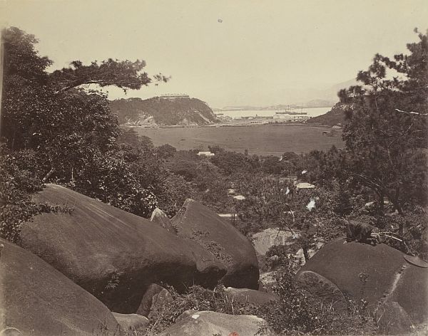 香港島北岸。由東角山(利園山)向西拍攝,近處為銅鑼灣,左方山上有建物的是摩利臣山(Morrison Hill)上的馬禮遜學堂。最遠可見灣仔及中環市區。攝於1873年。
