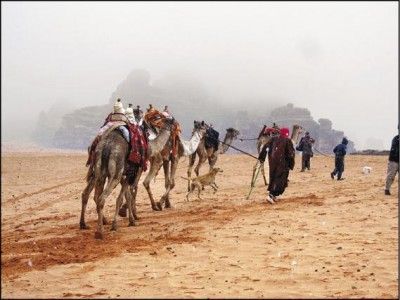 這次的沙漠之行,遇到了很奇特的氣候變化,先是乘坐吉普車進入沙漠,沒多久居然下起大風雪!遠遠看到駱駝頂著風雪漸漸走近,卻沒有人想去騎,大家只想趕緊躲進貝都因人架的帳篷內取暖,然而雪遇熱融成水,滴滴答答的滴下來,只好在帳蓬內撐起傘。