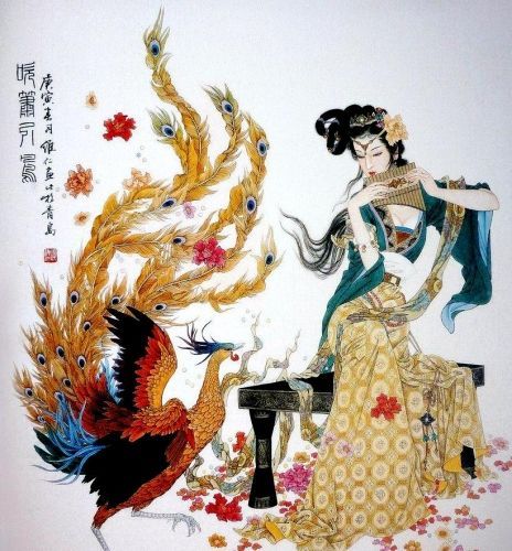 夫婦伉儷相得,日以吹簫為樂。十數年後,弄玉也得簫史吹奏之妙,指開笛響,能作鳳凰和鳴之聲,引得鳳凰聞聲后,紛紛飛聚於屋頂上。秦穆公特修築鳳台一座。后弄玉乘坐鳳凰,簫史駕奴飛龍,雙雙升天而去。