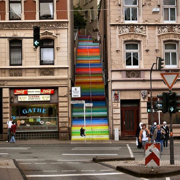 在德國的伍珀塔爾,有一個稱為荷爾斯泰因階梯(Holsteiner Stairs)共112階的階梯。踩在每一個鮮豔的色彩階梯上,簡直就像走在彩虹上。每一個階梯上還不同的德語單詞,譯成英語,有原諒、純真、原因、大笑…等等。