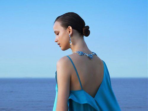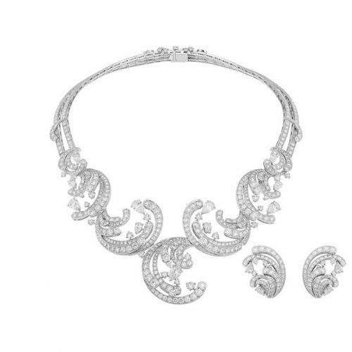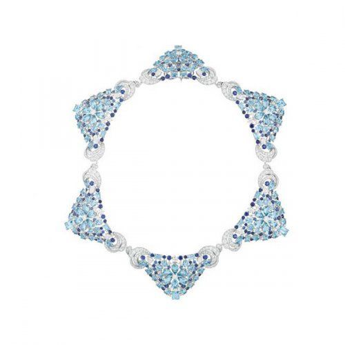 Lagune Précieuse華麗珠寶是對亞得里亞海之藍的一曲讚歌,它巧妙地鋪陳一組超過160克拉的海水藍寶,並搭配藍寶石和鑽石,勾勒出有着細膩層次變幻的馬賽克圖案。圓形、方形、橢圓形、八角形與梨形等多樣的寶石切割方式巧妙地排列,絢爛奪目的渦紋則將主題圖案鏈接起來。曲線與圖案於項鏈上相結合,項鏈的形狀靈感來自 Van Cleef & Arpels梵克雅寶的典藏臻品——創作於1928年的 Collerette項鏈。憑藉著出色的靈活性,寶石因此與肌膚緊密貼合,就像沉浸在水世界的微妙感召中,被浪花的翻滾與波濤的閃爍輕輕地搖曳着。