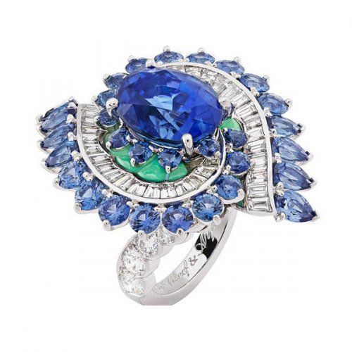 擁有優美靈動的曲線,Mer Des ÉToIles(星海)戒指靈感源自其名——星海的自然現象。鑽石與藍寶石的閃爍與成千上萬的發光體遙相呼應,彷彿將天上的繁星倒映於海岸。寶石勾勒出的雙螺線,將一顆7.29克拉的斯里蘭卡藍寶石獨特深邃的藍照耀出來。襯托這顆藍寶石的是經過精雕細琢的綠玉髓,更加突顯設計的水色變幻。