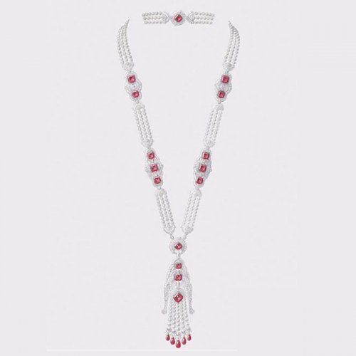 KizIl的命名源自土耳其語,意謂紅色,過去被用來表示“西方”,這條長項鏈演繹海上日落的炫麗。排列整齊的白色養殖珍珠被15顆共重45.09克拉的粉紫色調方形切割紅碧璽點綴得錯落有致。通過無比精細的搭配,紅碧璽映襯着珍珠與珍珠母貝的柔和,以及不同的鑽石切割(圓形、方形、長方形與梨形切割)所凝聚成的珠寶主題圖案,整體結構顯得光輝燦爛。形狀與色調的混搭為長項鏈注入生命力與立體感,5顆光芒四射的紅碧璽墜飾形成“裝飾藝術”(Art déco)風格的中央圖案,為作品設計錦上添花。這條長項鏈堪稱世家頂級珠寶精湛工藝的典範,它可轉換成端莊優雅的短項鏈或手煉。
