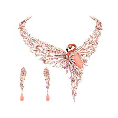 Van Cleef & Arpels梵克雅寶深為鳥兒歡快和多彩的身姿所着迷,再一次以其設計向飛鳥致敬。地中海岸是纖細優美的紅鶴的棲息地,項鏈上的紅鶴以伸展的雙翅繞頸,呈現細膩如粉彩般的抱姿。通過栩栩如生的演繹,裝飾着粉色剛玉與鑽石的羽毛被重新塑造,進而展現出無比輕盈之姿。這些梨形切割寶石就像珍貴無比的小水滴,融合不同珊瑚的雙重色調,完美勾勒中央圖案。紅鶴的身體覆滿輕盈羽毛,弧面的立體感出類拔萃,此部分也可作為胸針佩戴,與世家可轉換式珠寶設計一脈相承。