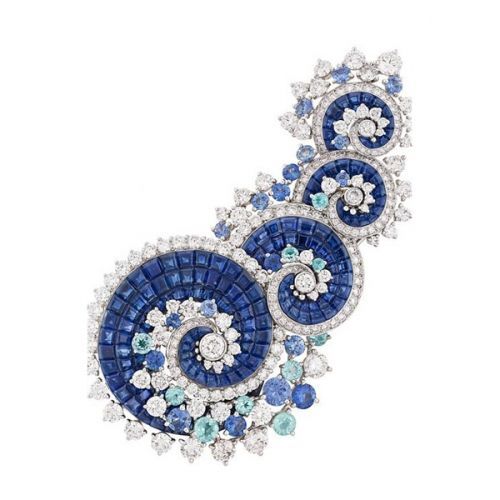 Van Cleef & Arpels梵克雅寶Vagues Mystérieuses胸針,以精緻微妙的藍色調展現絕美渦紋。隱密式鑲嵌的波浪烘托藍寶石的深邃色彩,浪花的繾綣與前仆後繼隱喻涌浪的滾動。這些螺旋紋以其彎曲流暢的外型與鋪鑲寶石的輪廓,堪稱真正的珠寶傑作。由鑽石、藍寶石和帕拉伊巴(Paraíba)碧璽精鑲而成的主題圖案,讓這片貴寶石之海充滿生命力。