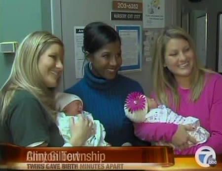 Amy Gilbert和Allison Oliverio是一對雙胞胎,也是好朋友,她們共同分享了很多相似的人生經歷,包括生孩子。在Henry Ford Macomb醫院裡,她倆的產房就隔了一道牆,這對25歲的雙胞胎於同一天誕下了她們的第一胎,時間只相差14分鐘,兩個孩子的體重也只相差一磅零一英寸。