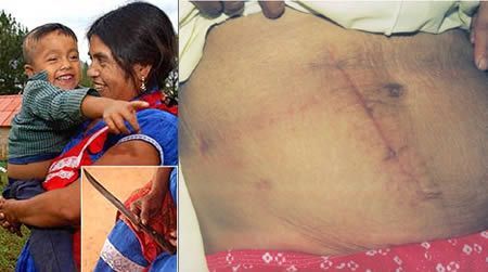 這是一位艱難的母親,她臨產時丈夫正在一家小酒店喝酒,家裡和酒店裡都沒有電話,而最近的外科診所位於80公里外,道路崎嶇難行。熬過了陣痛的12小時後,這位40歲的嬌小女人,六個孩子的媽媽,決定自己實施手術。藉著昏暗的燈光,她劃開了自己的皮膚、脂肪和肌肉,探進子宮,取出了一個男嬰。當血流不止時,她讓她6歲的兒子拿了一條毛巾堵住傷口。幾個小時後,村裡的醫生髮現她清醒地躺在剛降生的嬰兒身邊,便用家用的針線給她縫合了創口,用車把她載到了診所。這一切發生在2000年3月5日,如今,這位堅強的母親被認為是醫學上的奇蹟,她是已知的唯一一個為自己實施了剖腹產手術還存活下來的人。