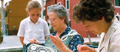 島上僅存仍會刺繡技術的老婆婆,正在示範給年輕女孩這項美麗的技藝。