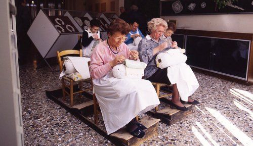 一踏上這個島嶼,你便會發現幾乎小店販賣的商品,衣服、扇子、面具、桌巾、手帕多不勝數,都是由各式的蕾絲織成。從14世紀開始,由於歐洲黑死病爆發的影響,原本最古老的手工蕾絲產地布魯日,由於君主專制、高額課稅等壓力,漸漸把技術和家庭一起南移到了威尼斯,在 BURANO小島落地生根,成就了今時蕾絲島的美名。因為此島的男性居民多以漁為業,婦女在家時常常思念期盼丈夫的歸來,於是聚會時發展出用一針一線織下對丈夫的愛情及思念的手工藝—這浪漫的傳說造就了BURANO手工蕾絲工坊的崛起。