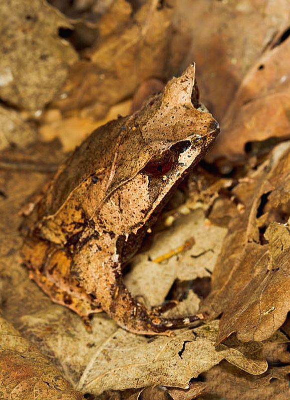 哥倫比亞,阿馬卡亞庫(Amacayacu)國家公園。一隻蝠面蟾蜍(Bat-faced Toad)藏身在枯葉之中。