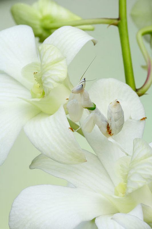 一隻蘭花螳螂(Orchid Mantis)藏身在花叢中。