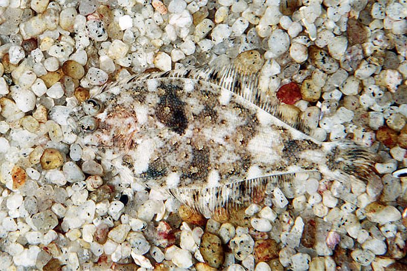 一條斑點鰈(Speckled Sanddab)與背景的海底鵝卵石融合為一。