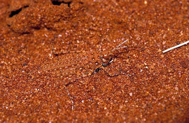一隻沙蚤(Sandhopper),把紅色沙子踢飛撒在身上,保護自己。