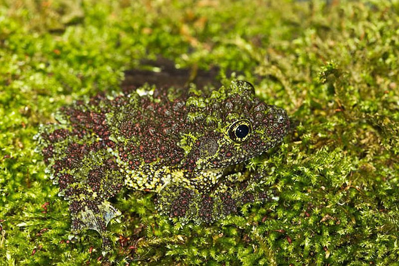 一隻越南苔蘚蛙(Vietnamese Mossy Frog),藏身在青苔中。