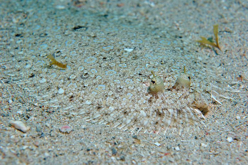 在加勒比海的多巴哥(Tobago),一條凹吻鮃(比目魚,peacock flounder)平躺在海砂上。