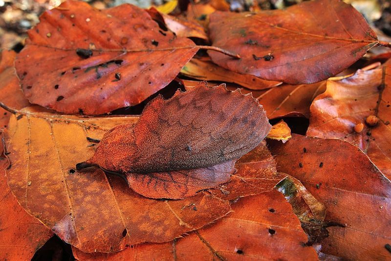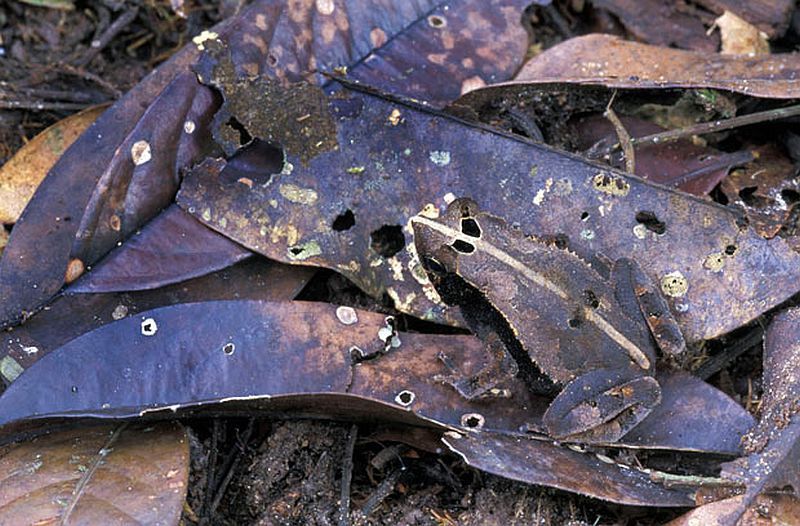 一隻葉蛙(Leaf Frog)偽裝成落葉。