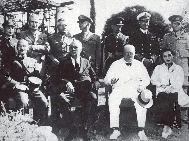 1943年11月25日,蔣介石、羅斯福、丘吉爾及宋美齡(前排左起)等人在開羅會議期間合影