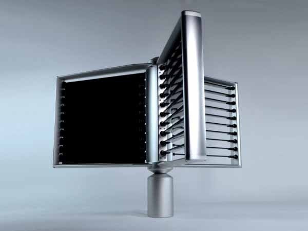 這是一具海洋渦輪機。渦輪由三組葉片組成,當他們以與水流相同的方向運動時,他們則會關閉。當葉片關閉時,他們會形成一道障礙,水流必須推動葉片才能通過。當水流推動關閉的葉片時,將使軸心與發電機旋轉,併產生電力。