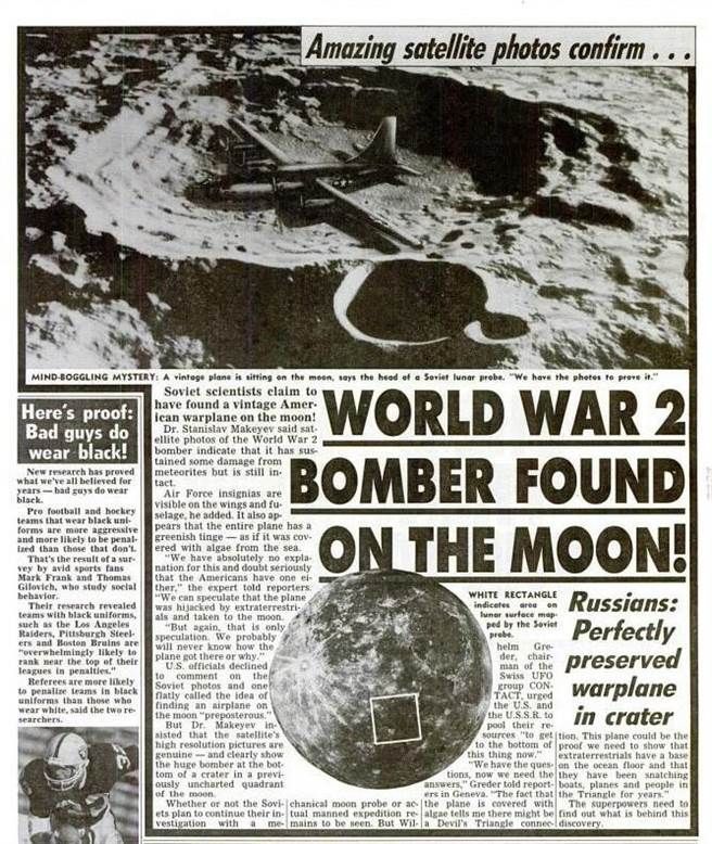 而在此“發現”公布前的1987年,前蘇聯也曾公布“衛星掃瞄”發現有一架“二戰”時期的美國老式轟炸機停在月球背面的隕石坑裡,從衛星傳真照片上可以清晰地辯認出機上的美軍軍徽標誌。