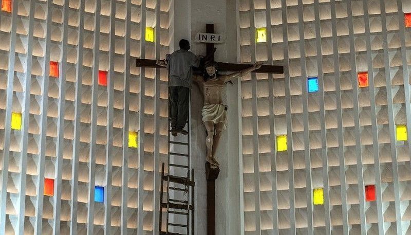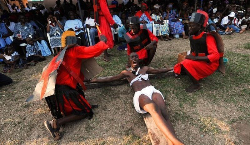 在2009年復活節週五,象牙海岸(Ivory Coast)的阿比讓(Abidjan),天主教徒扮演耶穌被釘在十字架。在撒哈拉以南的非洲,有大約1億7100萬名的天主教徒。