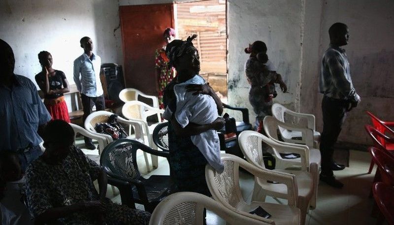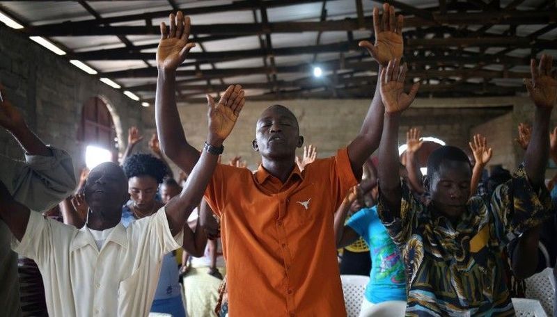 2016年,在利比里亞(Liberia;賴比瑞亞)首都蒙羅維亞(Monrovia)的貧民區的一個濱海教堂中,許多人在禮拜中祈禱。