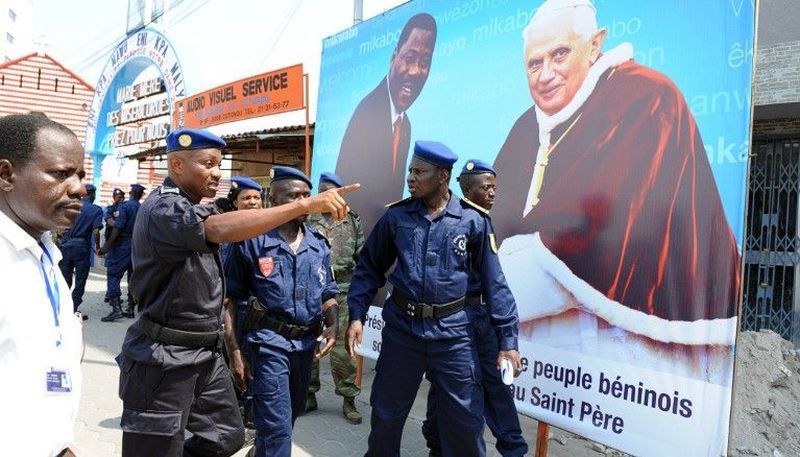 在2011年的貝寧(Benin),警察路過的背後是教皇本篤十六世(Pope Benedict XVI)到訪的宣傳招牌。