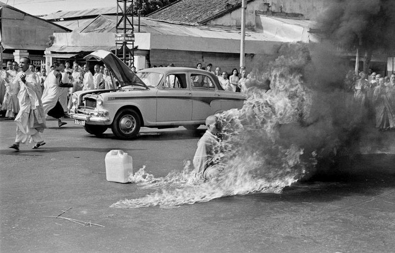 1963年6月,佛教僧侶釋廣德在西貢街頭自焚而死,向抗議南越政府佛教徒受到迫害。攝影師為布朗(Malcolm Browne)。