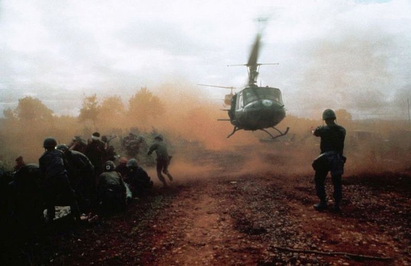 1965年,美國直升機正在將傷兵撤離一處遭越共伏擊的軍營。攝影師為Tim Page。