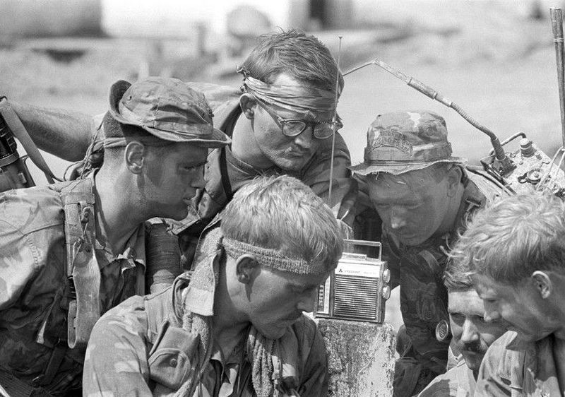 1966年,在越戰的美軍士兵正在收聽廣播。攝影師為Oliver Noonan。他在1969年8月,因為搭乘的直升機在峴港附近被擊落而罹難。