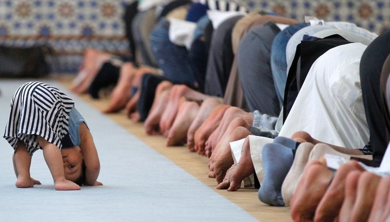 在法國,一個孩子在等待進入斯特拉斯堡大清真寺裡作日中祈禱的親人。(斯特拉斯堡,7月9日)