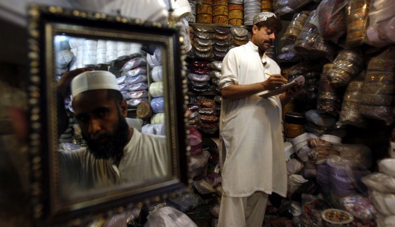 在巴基斯坦,一位顧客在試戴帽子,齋月開始要用的。(白沙瓦,7月9日)