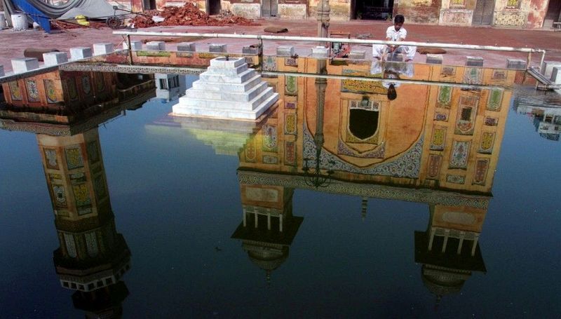 在巴基斯坦,一名穆斯林男子在古老的瓦齊爾汗清真寺(Wazir Khan mosque),在晚禱前進行沐浴儀式(ablutions) 。(拉合爾,7月10日)