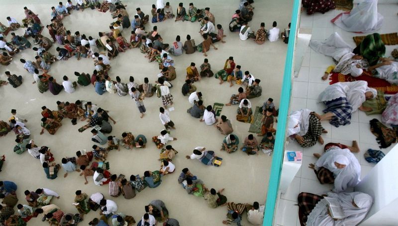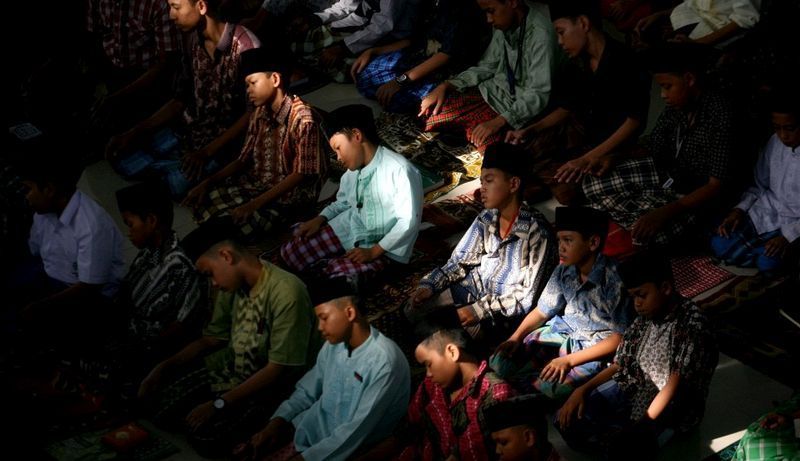 在印尼的一所伊斯蘭寄宿學校裡,學生正在做下午祈禱。(棉蘭,7月10日)
