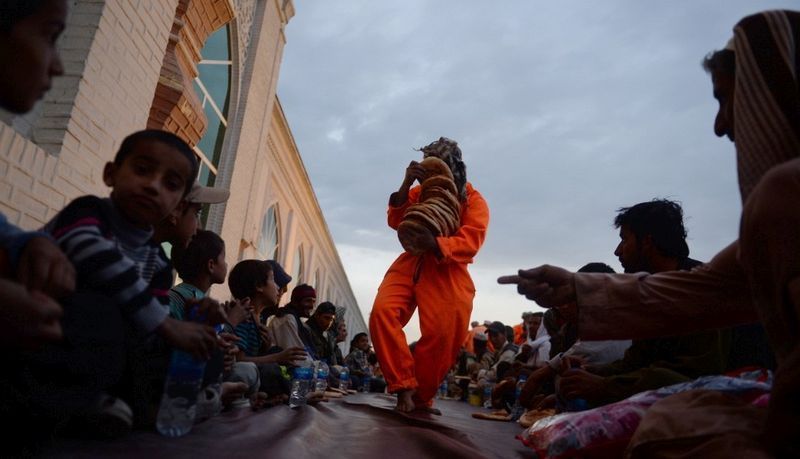 在阿富汗的一個清真寺,一名男子在夜間開齋飯時分發麵包。(喀布爾,7月10日)