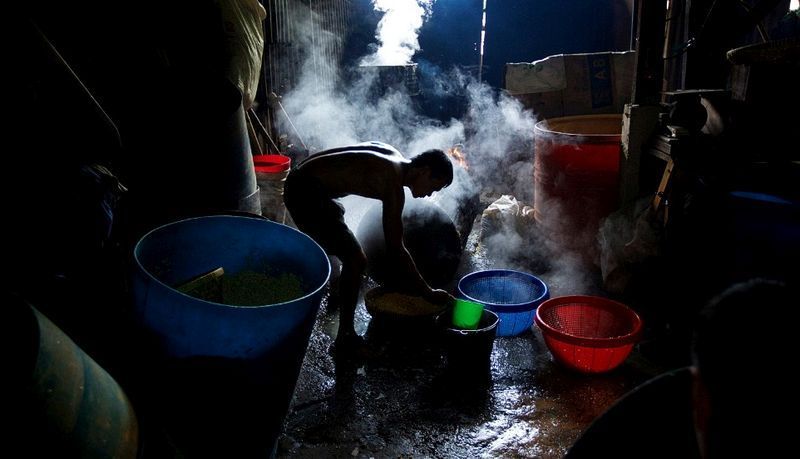 在印尼雅加達的一間小工廠,一名工人正在清洗和瀝乾黃豆,這是當地主食的原料。印尼政府已經表示,會在齋月期間 增加黃豆進口量,以應付齋月所需。(雅加達,7月12日)